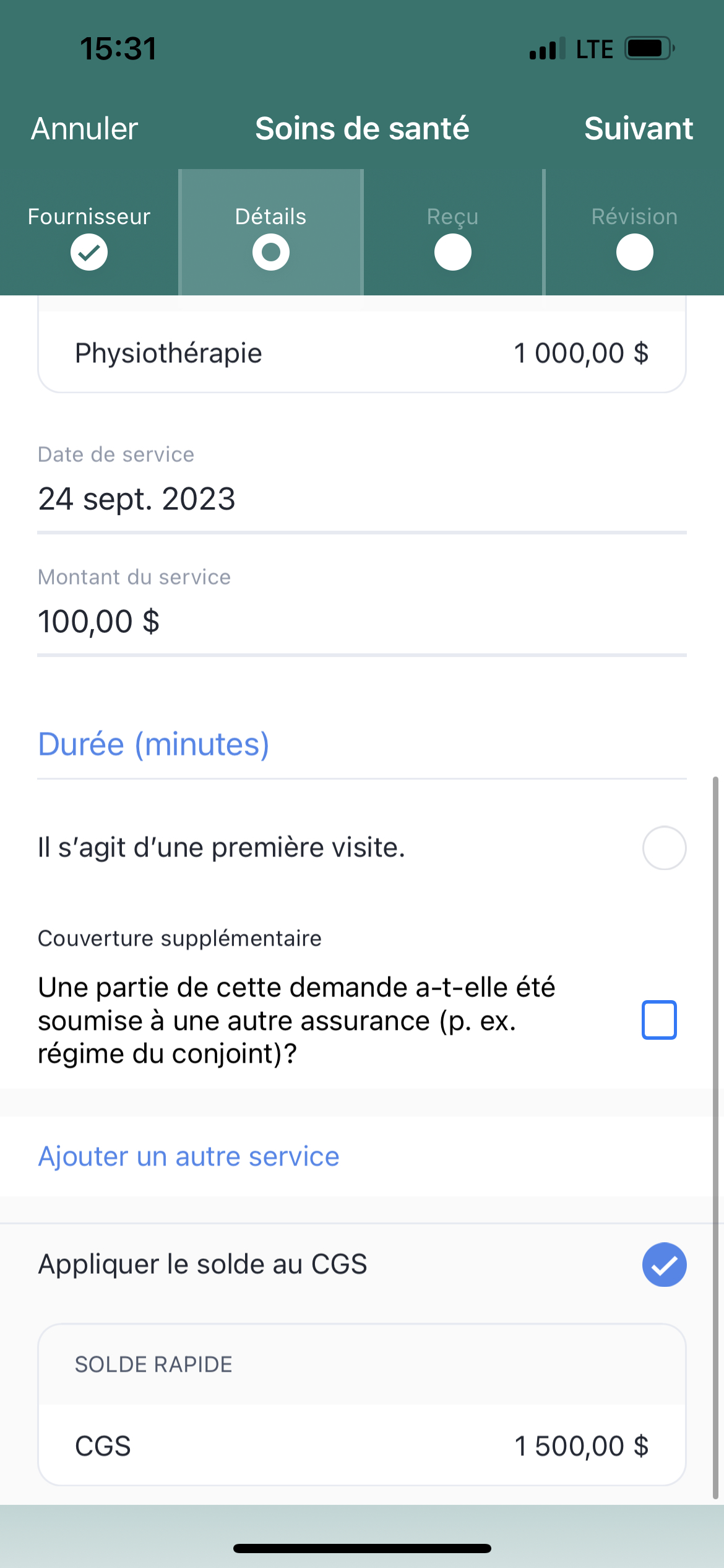Les détails de la demande seront déjà affichés et vous y verrez aussi le solde admissible au remboursement.